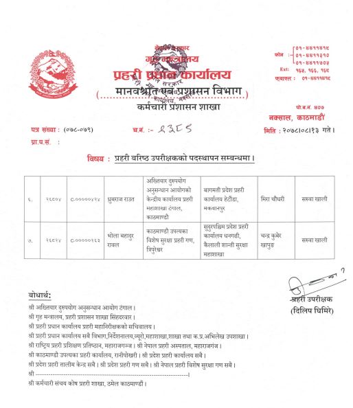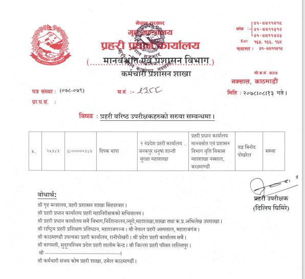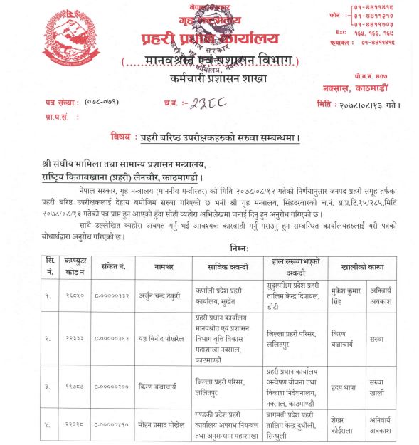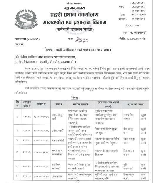 नेपाल प्रहरीका पाँच एसएसपीको सरुवा, सात एसएसपी र सात एसपीको पदस्थापना (सूचीसहित)