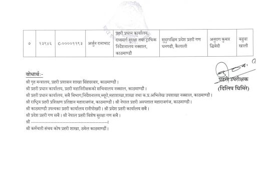 जसमा कर्णली प्रदेश प्रहरी कार्यालय सुर्खेतमा कार्यरत एसएसपी अर्जुनचन्द्र ठकुरीको सुदूरपश्चिम प्रदेश प्रहरी तालिम केन्द्र दिपायल डोटीमा, प्रहरी प्रधान कार्यालय मानवश्रोत एवम प्रशासन विभाग वृत्ति विकास महाशाखामा कार्यरत यज्ञ विनोद पोखरेलको महानगरीय प्रहरी परिसर ललितपुर, महानगरीय प्रहरी परिसर ललितपुरमा कार्यरत किरण बज्राचार्यको प्रहरी प्रधान कार्यालय अन्वेषण योजना तथा विकास निर्देशनालयमा सरुवा भएको छ ।