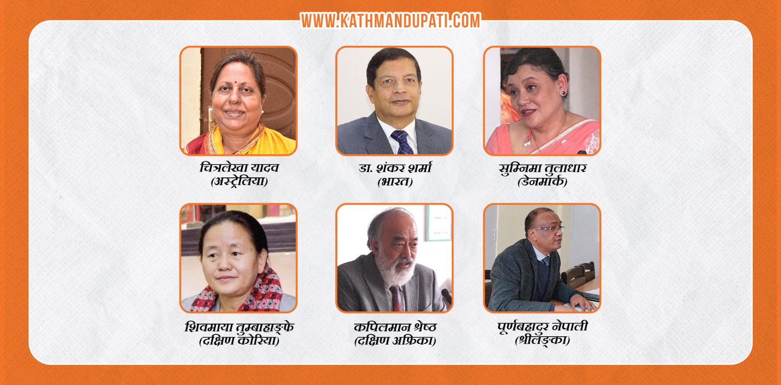 हाल भारत, अस्ट्रेलिया, डेनमार्क, दक्षिण कोरिया, दक्षिण अफ्रिका र श्रीलंकामा राजनीतिक रूपमा नियुक्त भएका राजदूत छन् । सरकारले उनीहरूलाई फिर्ता बोलाउन लागेको हो ।