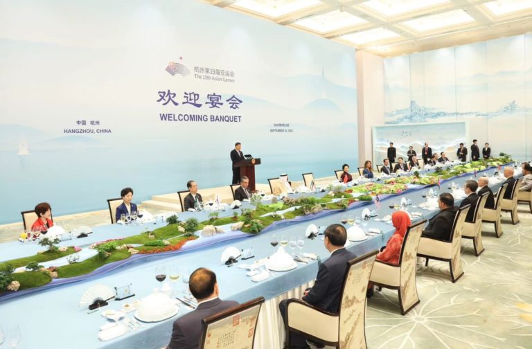 १९औं एसियाली खेलकुद प्रतियोगिता उद्घाटन समारोहमा सहभागी हुन चीनको चच्याङ प्रान्तको हाङचौं शहर पुगेका विशिष्ट अतिथिलाई दिवा भोज दिएर स्वागत गरिएको छ ।
