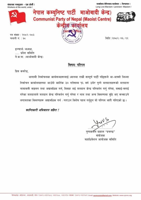 काठमाण्डु – नेकपा माओवादी केन्द्रले आगामी निर्वाचनलाई लक्षित गर्दै आफ्ना सबै तहका पार्टी पंक्तिलाई निर्वाचन कार्यालयहरूसँग समन्वय गरी मतदाता नामावली अद्यावधिक प्रक्रियामा सक्रिय सहभागिता जनाउन विशेष निर्देशन दिएको छ ।