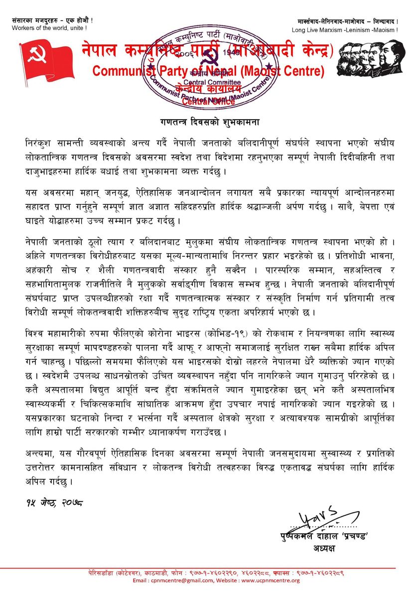 शनिबार गणतन्त्र दिवसमा शुभकामना सन्देश जारी गर्दै उनले नेपाली जनताको वलिदानीपूर्ण संघर्षबाट प्राप्त उपलब्धीहरुको रक्षा गर्दै गणतान्त्रिक संस्कार र संस्कृती निर्माण गर्न प्रतिगामी तत्व विरुद्धको एकतामा जोड दिएका हुन् ।