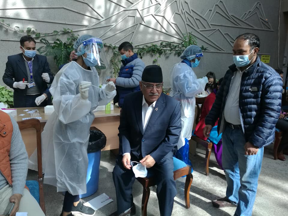 काठमाण्डु – माओवादी केन्द्रका अध्यक्ष पुष्पकमल दाहाल प्रचण्डले एन्टिजेन परीक्षण गरेका छन् । सोमबार बिहान संसद भवन नयाँ बानेश्वर पुगी उनले कोभिडका लागि एन्टिजेन विधिमार्फत परीक्षण गरेका हुन् ।