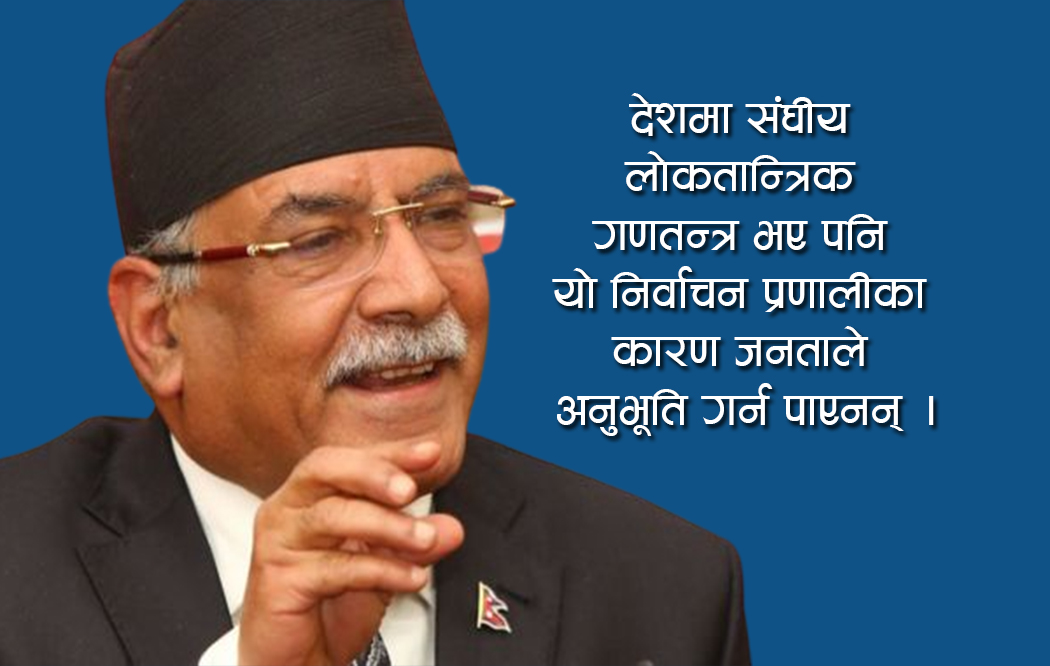 उनले वर्तमान निर्वाचन प्रणाली परिर्वतन गनुपर्ने संकेत गरेका छन् । प्रचण्डले यसबारे मुख नखोले पनि आजको अभिव्यक्तिबाट सहजै अनुमान गर्न सकीन्छ की उनी वर्तमान निर्वाचन प्रणाली परिर्वन गर्ने रणनीतिमा लागेका छन् ।