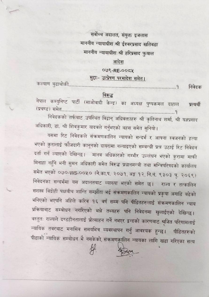 काठमाण्डु- प्रधानमन्त्री तथा नेकपा (माओवादी केन्द्र)का अध्यक्ष पुष्पकमल दाहाल प्रचण्डविरुद्ध रिट दर्ता गर्न दिइएको सर्वोच्च अदालतको आदेशमा द्वन्द्वपीडितले न्याय पाउनुपर्ने विषय अनन्तकालसम्म अल्झाइ राख्न नहुने उल्लेख गरिएको छ ।