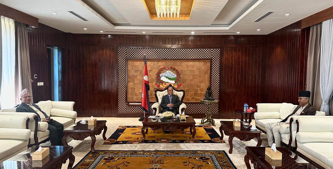 काठमाण्डु- प्रधानमन्त्री पुष्पकमल दाहाल प्रचण्ड, नेपाली कांग्रेसका सभापति शेरबहादुर देउवा र नेकपा एकीकृत समाजवादीका अध्यक्ष माधव कुमार नेपालबीच भेटवार्ता भएको छ।