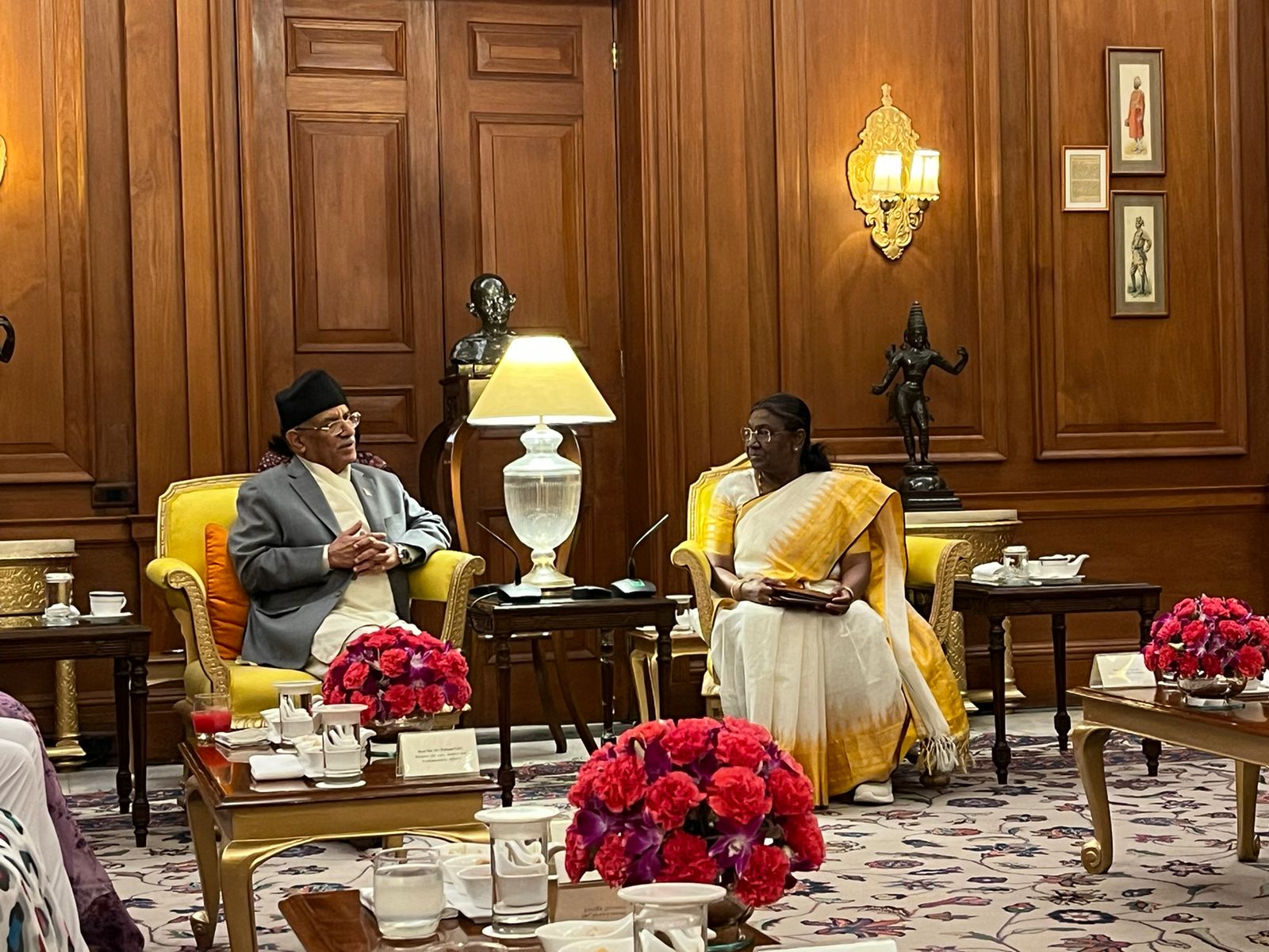 काठमाण्डु –भारतको औपचारिक भ्रमणमा रहेका प्रधानमन्त्री पुष्पकमल दाहाल ‘प्रचण्ड’ले राष्ट्रपति द्रौपदी मुर्मुसँग शिष्टाचार भेट गरेका छन् । नयाँ दिल्लीस्थित राष्ट्रपति भवनमा आज प्रधानमन्त्री प्रचण्डले राष्ट्रपति मुर्मुसँग भेट गरेका हुन् ।