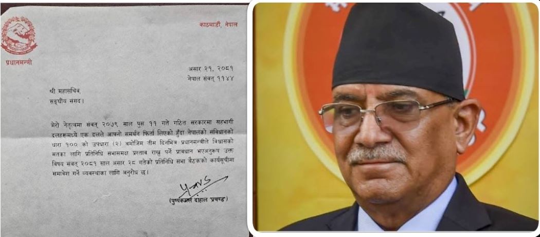 काठमाण्डु – प्रधानमन्त्री पुष्पकमल दाहाल ‘प्रचण्ड’ले २८ असारमा विश्वासको मत लिने जानकारी संघीय संसद् सचिवालयलाई गराएका छन् । संघीय संसद् सचिवालयका महासचिवलाई पत्र लेख्दै प्रचण्डले आज पत्र लेख्दै २८ असारमा विश्वासको मत लिने जानकारी गराएका हुन् ।