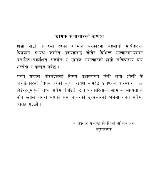 विज्ञप्तिमा भनिएको छ, ‘मन्त्रिमण्डल फेरबदलको विषय प्रधानमन्त्री केपी शर्मा ओली कै क्षेत्राधिकारको विषय रहेको कुरा अध्यक्ष कमरेड प्रचण्डले बारम्बार जोड दिईरहनुभएको तथ्य सबैमा विदितै छ । पत्रकारिताको सामान्य मान्यताको पनि ख्याल नगरी भएको यस प्रकारको दुश्प्रचारको भ्रममा नपर्न सबैमा आग्रह गर्दछौं ।’