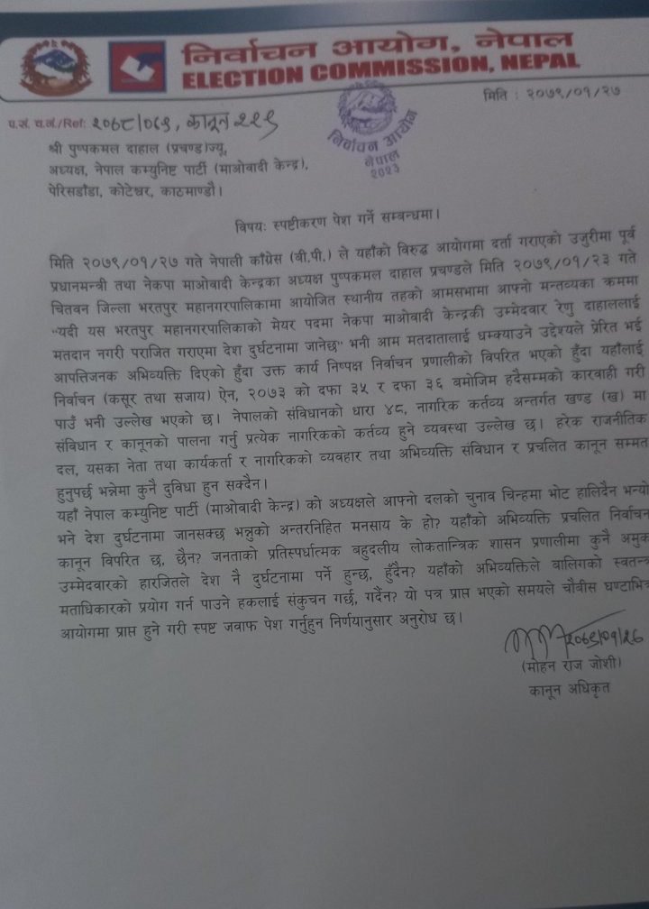 प्रचण्डले आम मतदातालाई धम्क्याउने उद्देश्यले प्रेरित भई आपत्तिजनक अभिव्यक्ति दिएको पत्रमा उल्लेख गरिएको छ । आयोगले पत्र प्राप्त भएको २४ घण्टाभित्र स्पष्टिकरण बुझाउन निर्देशन दिएको छ ।