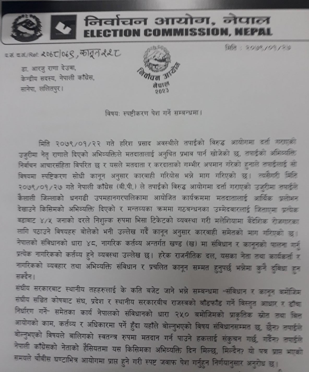 त्यस्तै कांग्रेस नेतृ देउवालाई गठबन्धनका उम्मेदवारलाई जिताए हरेक वडाबाट ४, ५ जनाका दरले निःशुल्क रूपमा भिसा टिकेटको व्यवस्था गरी मलेसिया पठाउने विषयमा बोलेको भन्दै आयोगले स्पष्टीकरण सोधेको हो ।