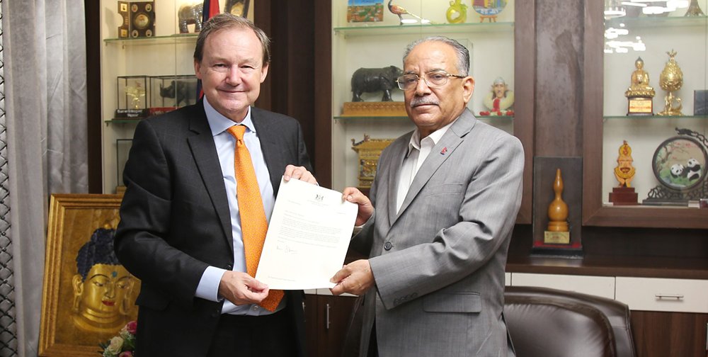काठमाण्डु–नेपाल कम्युनिस्ट पार्टी (माओवादी केन्द्र) का अध्यक्ष पुष्पकमल दाहाल ‘प्रचण्ड’सँग नेपालका लागि संयुक्त अधिराज्य बेलायतका राजदूत रोब फेनले भेट गरेका छन् ।