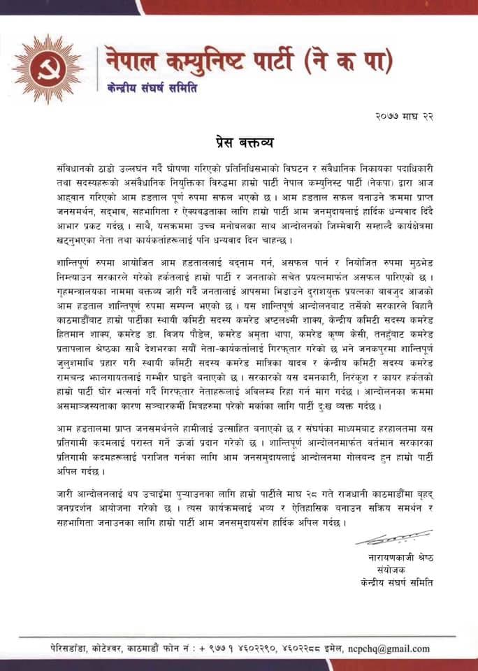केन्द्रीय संघर्ष समितिका संयोजक नारायणकाजी श्रेष्ठले विज्ञप्ति जारी गर्दै आमहड्तालमा प्राप्त सर्मथनले आफूहरूलाई उत्साहित बनाएको उल्लेख गरेका हुन् ।