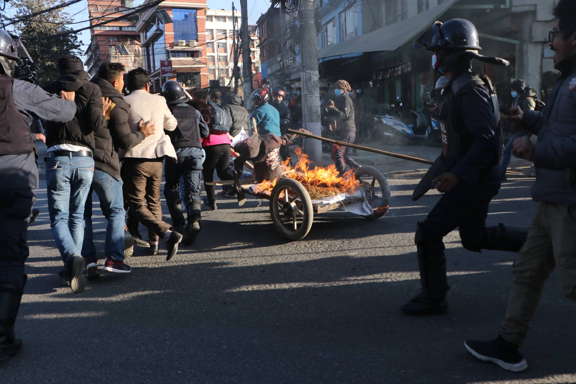प्रधानमन्त्री केपी शर्मा ओलीले चालेको संसद विघटनको कदम असंवैधानिक भन्दै उनीहरुले मण्डला नजिकै ओलीको पुतला दहनसमेत गरेका छन् । प्रधानमन्त्रीको पुत्ला जलाउने क्रममा प्रहरीले लाठीचार्ज गरेपछि प्रहरी र प्रदर्शनकारीबीच झडप भएको छ ।