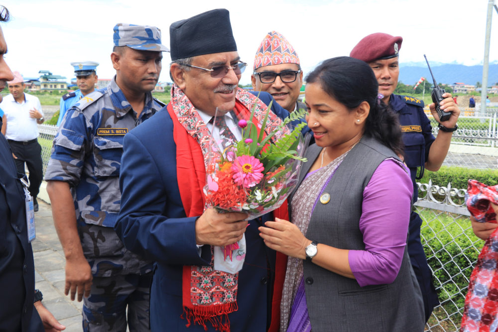 चितवन – सत्तारुढ दल नेपाल कम्युनिष्ट पार्टी (नेकपा)का अध्यक्ष पुष्पकमल दाहाल ‘प्रचण्ड’लाई बुधबार भरतपुर विमानस्थलमा स्वागत गर्दै भरतपुर महानगरपालिका प्रमुख रेणु दाहाल । तस्वीर स् नारायण अधिकारी –रासस