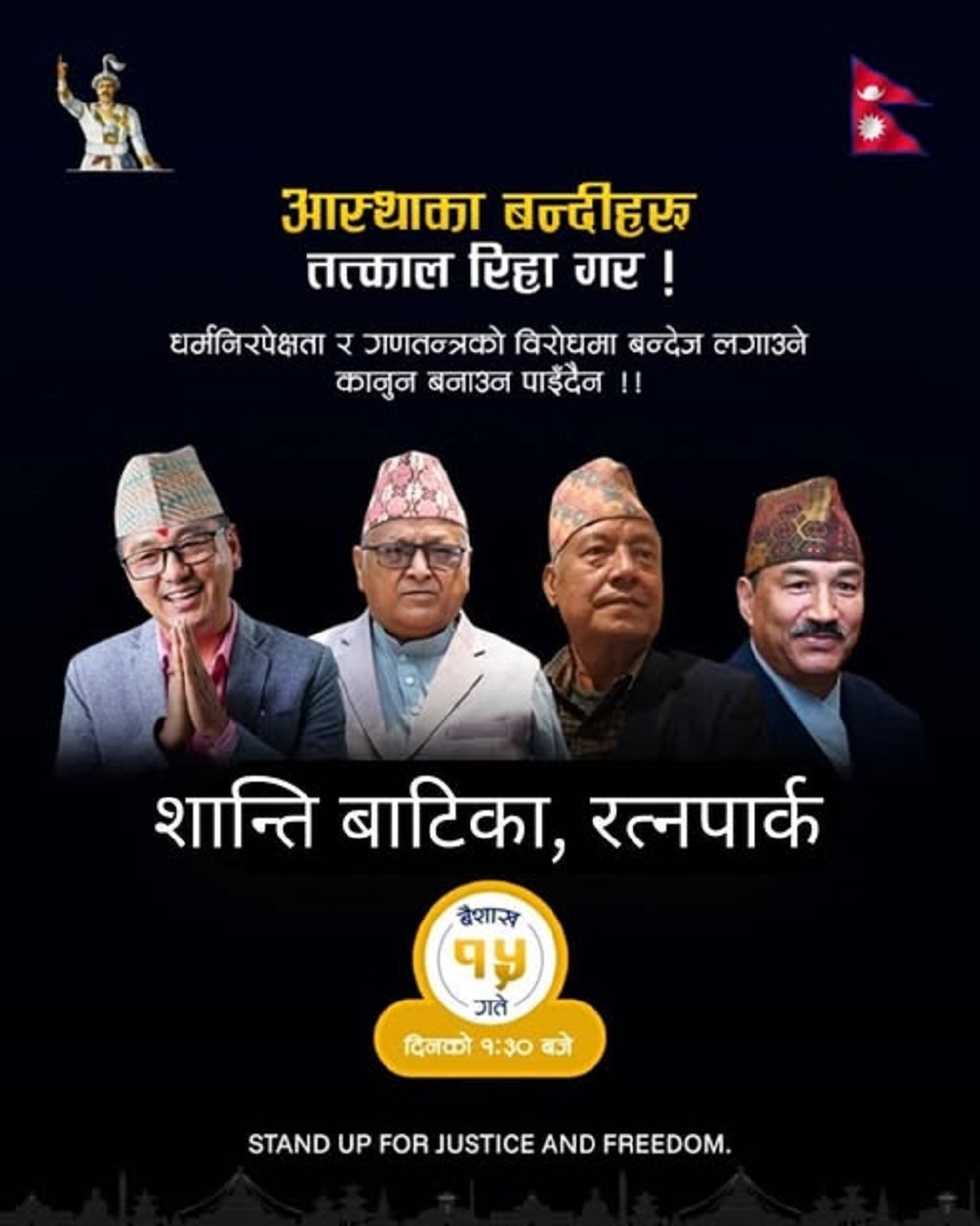 चैत १५ गते तिनकुने घटनामा पक्राउ परेकाहरुको तत्काल रिहाई र राजसंस्था र धर्मनिरपेक्षताको बिरोधमा बन्देज बनाउने कानुन निर्माण हुन लागेकोमा त्यो तत्काल रोकिनु पर्ने भन्दै राप्रपा नेपालले प्रदर्शन गर्न लागेको हो ।