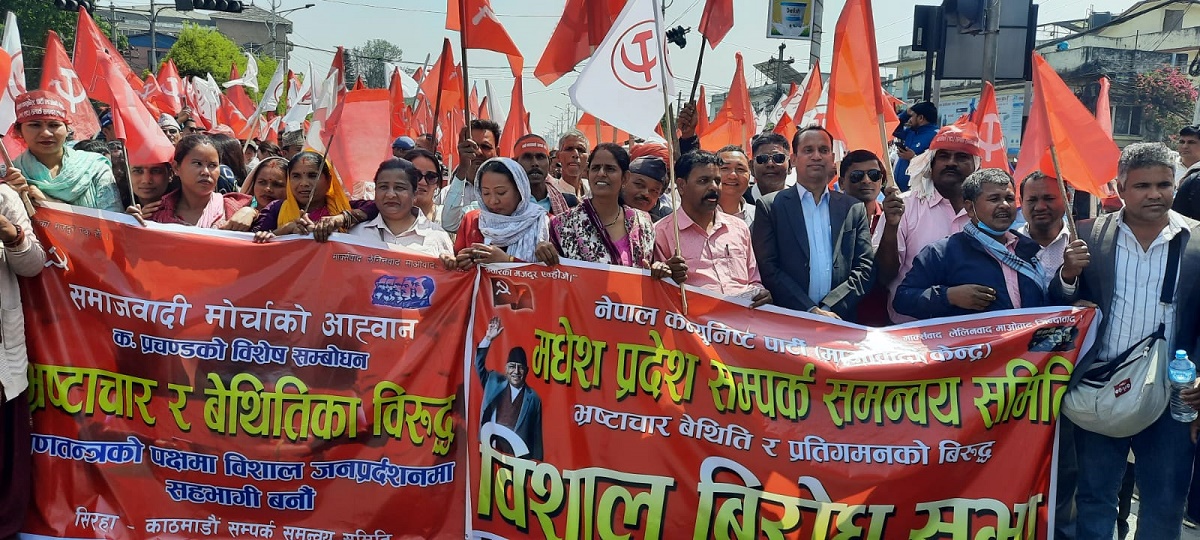 मोर्चाले विभिन्न स्थानमा प्रदर्शन गर्दै भृकुटीमण्डपमा सभा गर्दैछ । मोर्चामा आवद्ध नेकपा (माओवादी केन्द्र), नेकपा (एकीकृत समाजवादी), नेपाल समाजवादी पार्टी (नेसपा) र नेपाल कम्युनिष्ट पार्टीले विभिन्न ठाउँबाट जुलुश निकालेर गर्दैछन् ।