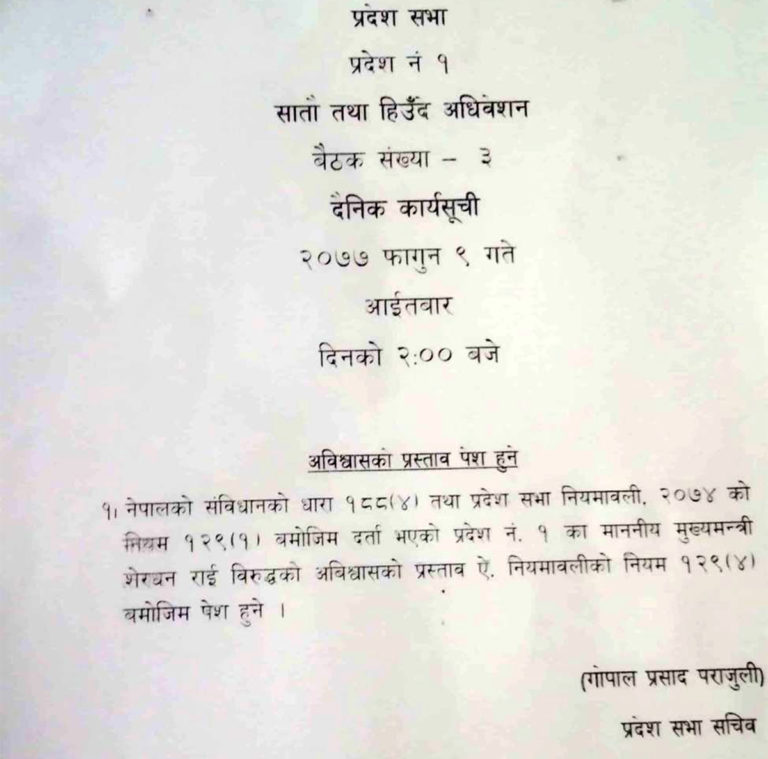 प्रदेश १ः प्रदेश सभा बैठकमा मुख्यमन्त्री विरुद्धको अविश्वासको प्रस्ताव पेश हुने
