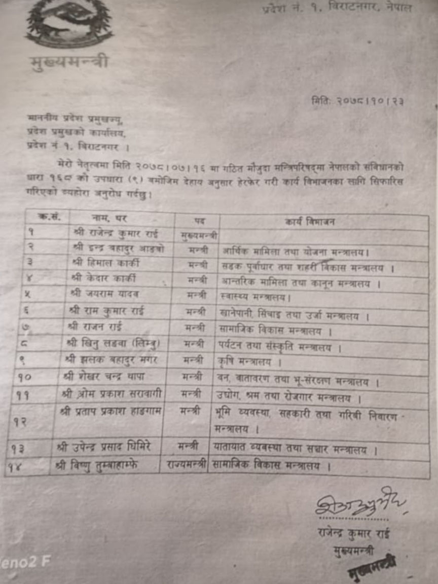 सत्ता गठबन्धन सरकारमा मन्त्रीका आकांक्षी धेरै भएपछि मुख्यमन्त्री राईले ७ बाट मन्त्रालय फुटाएर १३ मन्त्री र एक राज्यमन्त्री बनाउँदै मन्त्रिपरिषदलाई पूर्णता दिएका हुन् । नवनियुक्त मन्त्रीहरुले आजै पद तथा गोपनीयताको शपथ लिएका छन् । मुख्यमन्त्री राजेन्द्र राईको सिफारिसमा प्रदेश प्रमुखले नवनियुक्त मन्त्रीहरुलाई आइतबार नै शपथ ग्रहण गराएका हुन् ।