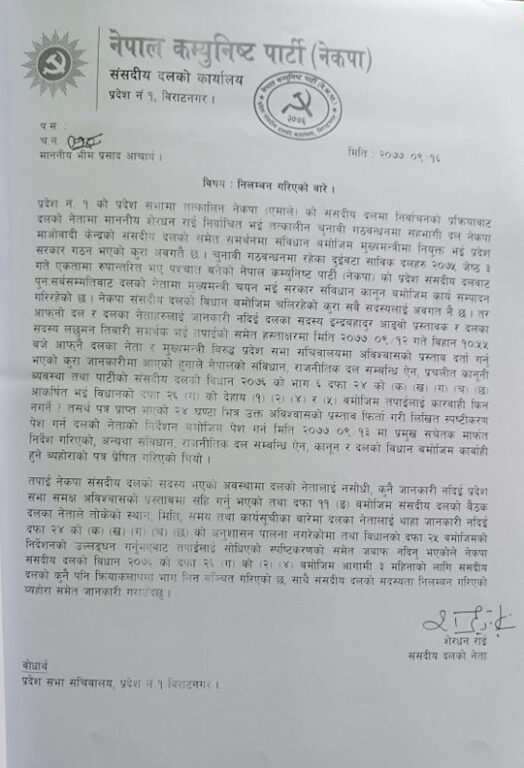 बिराटनगर – प्रदेश १ का मुख्यमन्त्री शेरधन राईले १५ जना सांसदलाई निलम्बन गरेका छन् । यसअघि प्रचण्ड–नेपाल समूहले मुख्यमन्त्री राईलाई संसदीय दलको नेताबाट हटाएको थियो ।