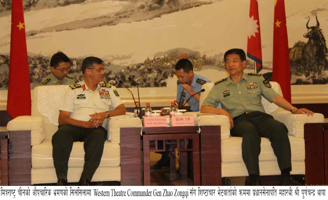मित्रराष्ट्र जनवादी गणतन्त्र चीनका जनमुक्ति सेनाको औपचारिक निमन्त्रणामा सप्ताहव्यापी भ्रमणका क्रममा चीन पुगेका प्रधानसेनापति थापाले चेंगदू, डुजुआंगान सिटीमा शिष्टाचार भेटवार्ता गरेका हुन् ।