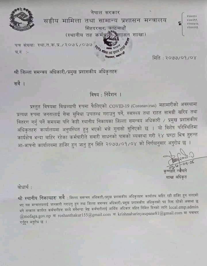 काठमाडौं – सरकारले २४ घण्टाभित्र हाजिर गर्न स्थानीय तहका प्रमुख प्रशासकीय अधिकृतलाई निर्देशन दिएको छ ।