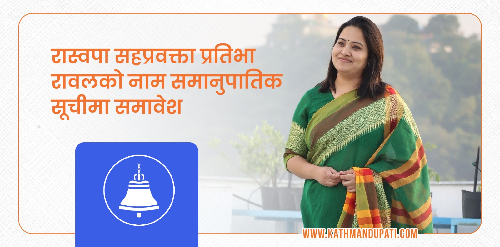 काठमाडौँ– राष्ट्रिय स्वतन्त्र पार्टी (रास्वपा) ले समानुपातिक निर्वाचन प्रणालीअन्तर्गत प्रारम्भिक उम्मेदवारको नामावली सार्वजनिक गरेको छ । पार्टीले शुक्रबार सार्वजनिक गरेको आकांक्षीको सूचीमा सुदूरपश्चिम प्रदेशबाट सहप्रवक्ता प्रतिभा रावलको नाम समावेश गरिएको छ । रावल रास्वपाको केन्द्रीय सदस्यसमेत हुन् ।