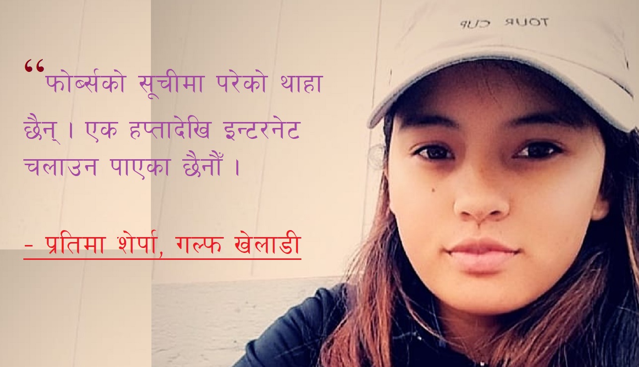 ‘के–कसरी नाम कमाइन् भन्ने थाहा छैन, जे गरेको भए पनि खुशी छौँ’, उनले खुशी प्रकट गर्दै भने । कोरोनाको त्रासले गल्फ खेल्न तथा अभ्यास गर्न कोही नआएकामा शेर्पा दम्पतीको मन खिन्न भएको छ । ‘सुनसान छ, कोरोनाको त्रासपछि यहाँ अचेल यहाँ चराको आवाज पनि सुनिन्न’, उनले भने । लकडाउन अघि ५०/६० जना नियमतरूपमा अभ्यास गर्न आउने गरेका शेर्पाले सुनाए । उनीहरुको मनमा छोरी प्रतिमाको जति माया छ त्यत्तिकै त्रास कोरोना भाइरसको पनि छ । ‘यस्तै त कतिसम्म रहला र गल्फ मैदानभित्र चाँडै पहिलाकै जस्तै चहलपहल भइहाल्ला’, उनीहरुले आशावादी हुँदै भने । प्रतिमाको प्रगति उसकै मुखबाट सुन्ने प्रतिक्षमा शेर्पा दम्पती छन् । उनीहरु अमेरिकाबाट छोरी चाँडै फर्कने प्रतिक्षा गर्दै विमानस्थलको बाटो हेरी बसेका छन् ।