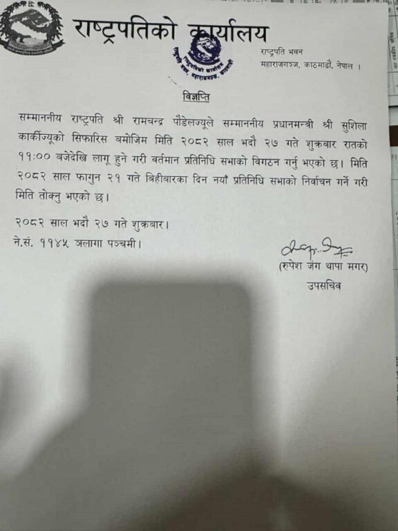 नवनियुक्त प्रधानमन्त्री कार्कीले गरेको विघटनको सिफारिस राष्ट्रपति पौडेलले सदर गर्दै आगामी फागुन २१ गते बिहीबारका दिन आम निर्वाचनको मिति घोषणा गरेका छन् । राष्ट्रपति पौडेलले गएराति ११ बजेदेखि लागू हुने गरी प्रतिनिधिसभा विघटन गरेका हुन् ।