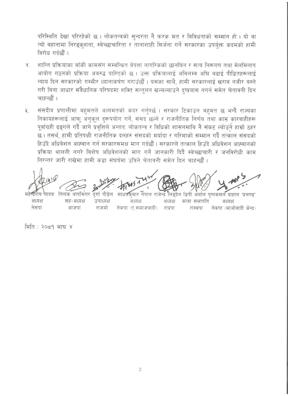 बैठकपछि जारी संयुक्त वक्तव्यमा लेखिएको छ, ‘सरकारले तत्काल हिउँदे अधिवेशन आह्वानको प्रक्रिया थालनी नगरे विशेष अधिवेशनको माग गर्ने जानकारी दिँदै स्वेच्छाचारी र जनविरोधी काम निरन्तर जारी राखेमा हामी कडा संघर्षमा उत्रिने चेतावनी समेत दिन चाहन्छौं ।’