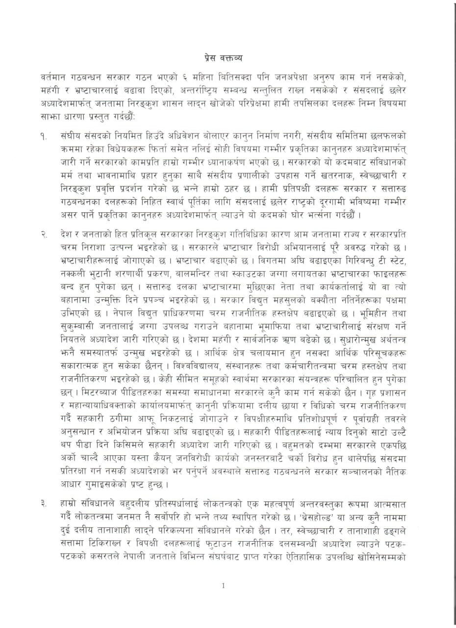 प्रतिपक्षीको वक्तव्यमा उल्लेख छ, ‘संसदीय प्रणालीमा बहुमतले अल्पमतको कदर गर्नुपर्छ । सरकार टिकाउन बहुमत छ भन्दै राज्यका निकायहरूलाई आफू अनुकूल दुरूपयोग गर्ने, संसद् छल्ने र राजनीतिक निर्णय तथा काम कारवाहीहरू पूर्वाग्रही ढंगले गर्दै जाने प्रवृत्तिले अन्ततः लोकतन्त्र र विधिको शासनमाथि नै संकट ल्याउने हाम्रो ठहर छ । तसर्थ, हामी प्रतिपक्षी राजनीतिक दलहरू संसदको मर्यादा र गरिमाको सम्मान गर्दै तत्काल संसद्को हिउँदे अधिवेशन आह्वान गर्न सरकारसमक्ष माग गर्दछौं ।’