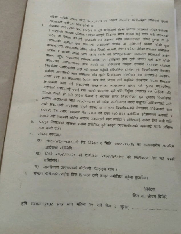 उनले मन्त्री आले र सचिव महेश्वर न्यौपानेले अदालतको अपहेलना गरेको भन्दै मंगलबार सर्वोच्चमा उजुरी दर्ता गराएका हुन् ।सर्वोच्चको अन्तरिम आदेशले काममा फर्किएका सीइओ रेग्मीलाई पटक पटक बाधा अड्चन पुग्ने गरि काम गर्न रोक लगाउन खोजेको भन्दै उनका तर्फबाट जीवन घिमिरेले वारेसनामामार्फत अपेहलना मुद्दा दर्ता गरेका हुन् ।