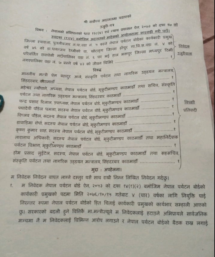 मन्त्री आलेविरुद्ध पर्यटन बोर्डका सीइओ रेग्मीले दिए सर्वोच्चमा उजुरी