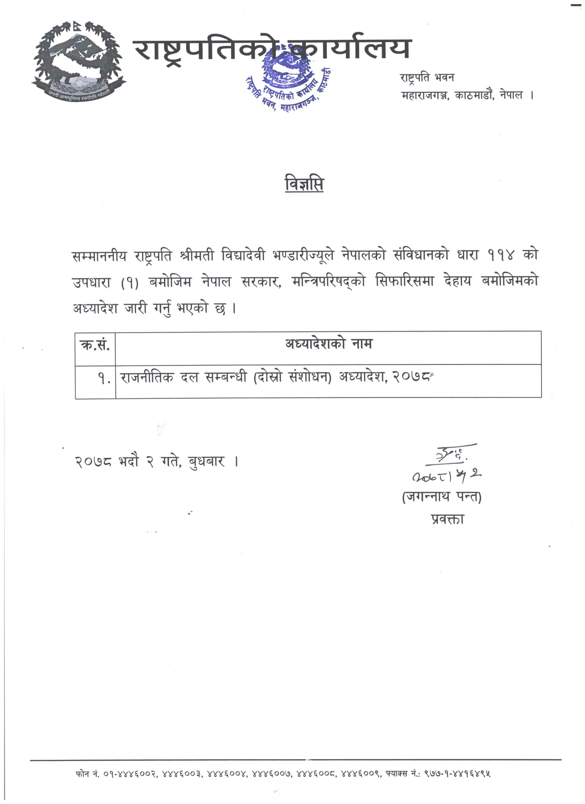 मंगलबार मन्त्रिपरिषद्को बैठकले अध्यादेश राष्ट्रपति समक्ष पेश गरेको थियो । राष्ट्रपति कार्यालयका प्रवक्ता जगन्नाथ पन्तले अध्यादेश जारी भएको पुष्टि गरे ।