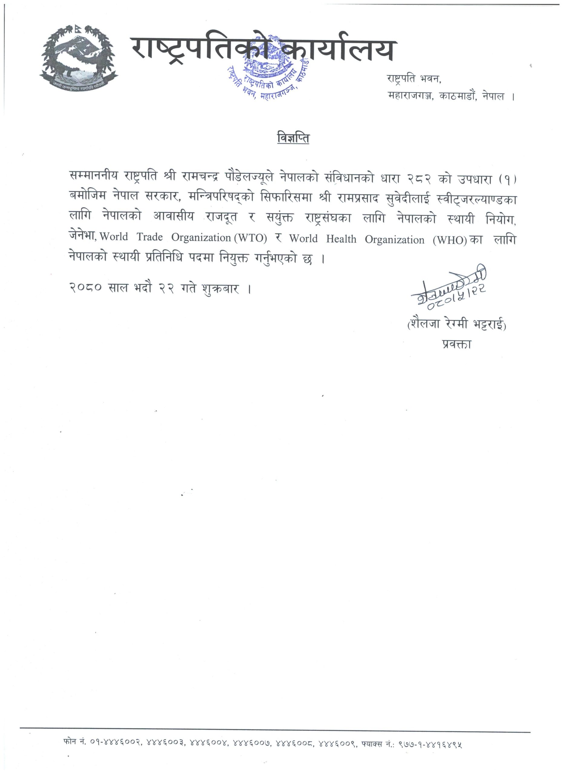 राष्ट्रपतिबाट स्वीट्जरल्याण्डका लागि नेपालको आवासीय राजदूतमा सुवेदी नियुक्त