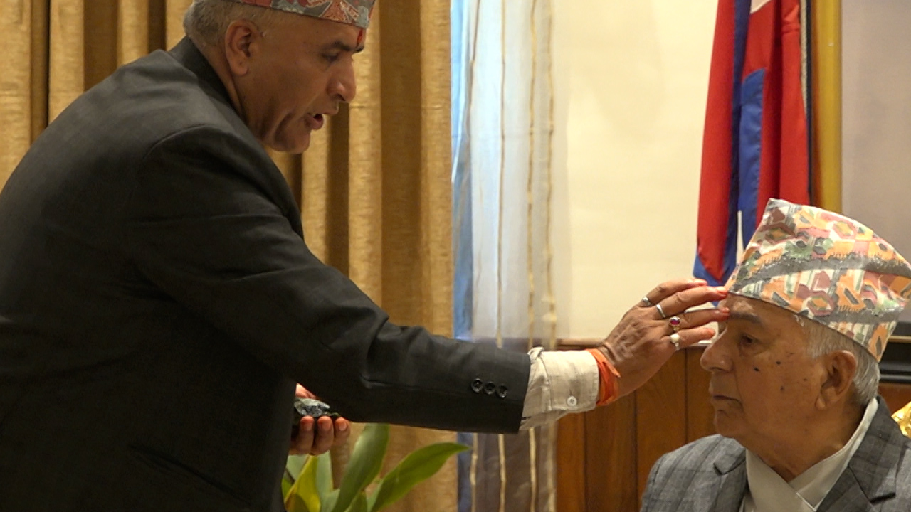 उनले हनुमान ढोका दरवारका गुरु देवराज आर्याल तथा राष्ट्रपतिका पुरोहित अर्जुनप्रसाद न्यौपानेबाट टिका र जमरा ग्रहण गरेका हुन् । आफूले टीका ग्रहण गरेपछि राष्ट्रपति पौडेलले प्रथम महिलासहित परिवारका सदस्यलाई टीका लगाईदिएका थियो ।