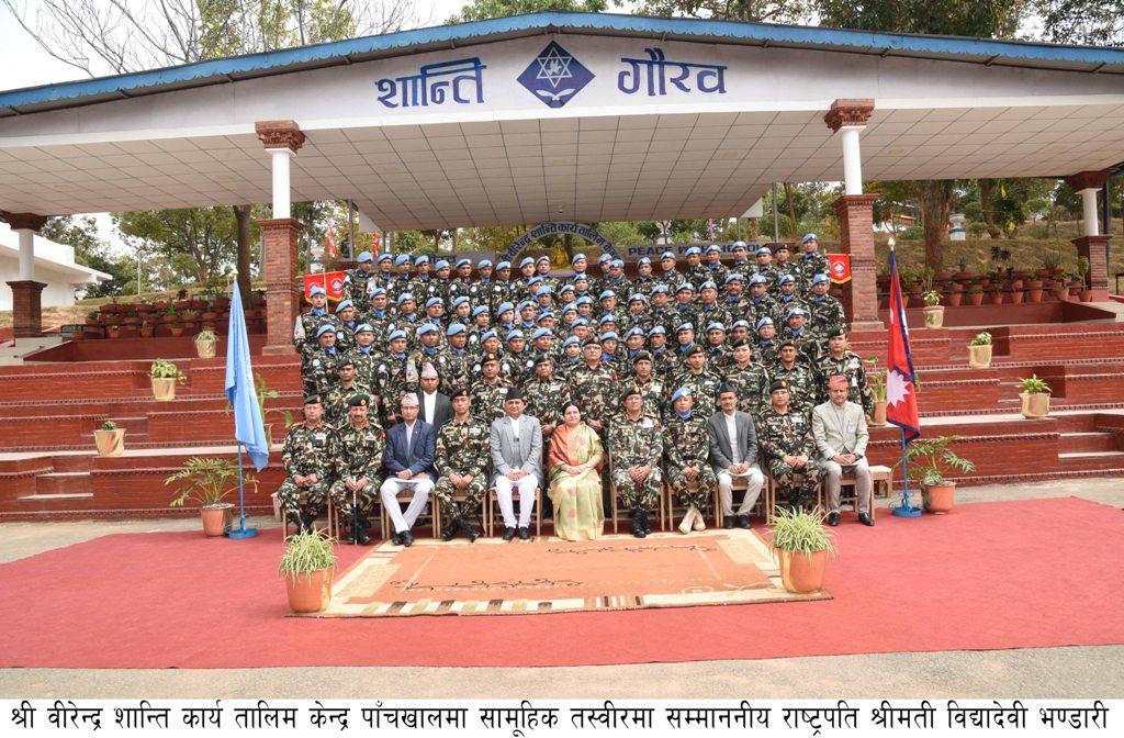 काठमाडौं – संयुक्त राष्ट्रसंघको आव्हानमा शान्ति स्थापनार्थ UNMISS Mission (अनमिस मिसन) दक्षिण सुडानमा तैनाथ हुन जाने देवीदत्त गण (शा.से.) नवौँ डफ्फाको आइतबार वीरेन्द्र शान्ति कार्य तालिम केन्द्र पाँचखालमा राष्ट्रपति एवं नेपाली सेनाका परमाधिपति विद्यादेवी भण्डारीले एक समारोहका बीच प्रि-डिप्लोयमेण्ट तालिमको समापन गरेकी छन् ।