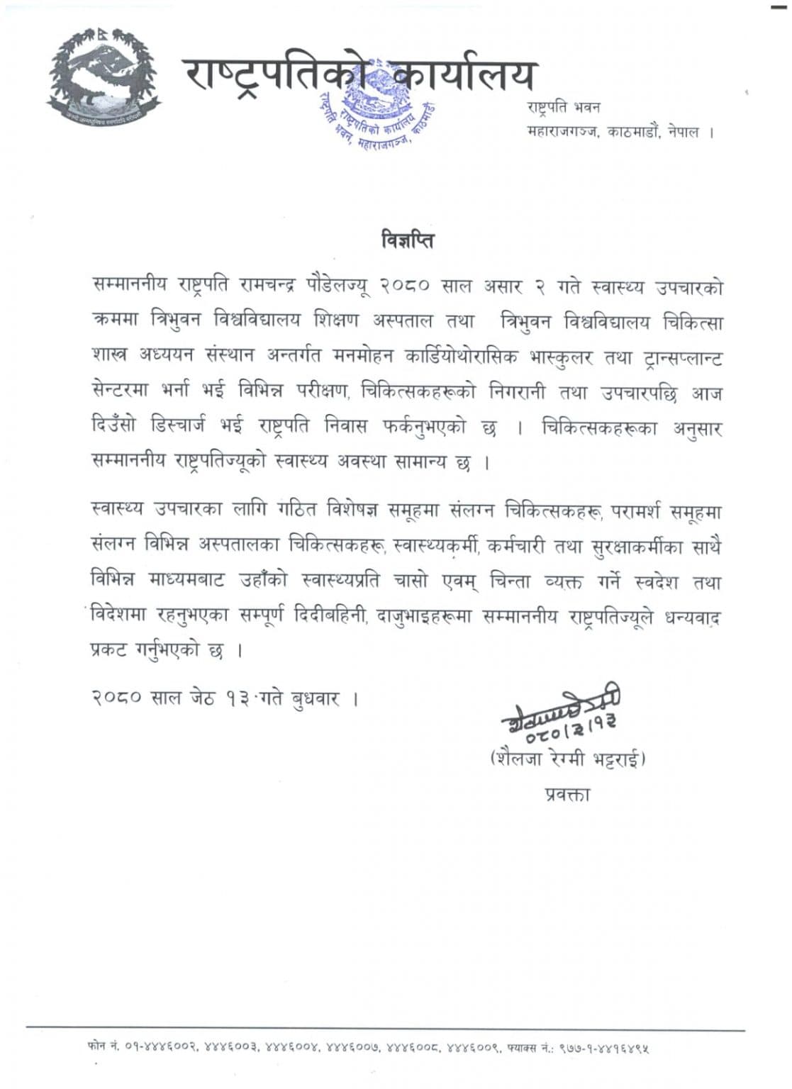 राष्ट्रपति कार्यालयले बुधबार विज्ञप्ति जारी गर्दै राष्ट्रपति पौडेलको स्वास्थ्य अवस्था सामान्य रहेको जनाए पनि उनको स्वास्थ्य अवस्था वा उपचार प्रक्रियाबारे कुनै जानकारी गराएको छैन। उनलाई मुटुसम्बन्धी समस्याका कारण अस्पताल भर्ना गरिएको हो।