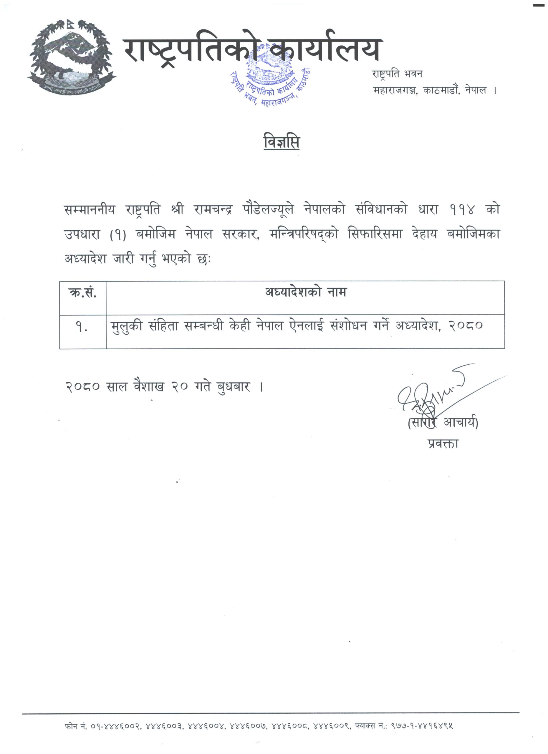राष्ट्रपति कार्यालयका प्रवक्ता सागर आचार्यले राष्ट्रपतिले संविधानको धारा ११४ को उपधारा (१) बमोजिम अध्यादेश जारी गरेको विज्ञप्तिमार्फत जानकारी दिएका छन् ।