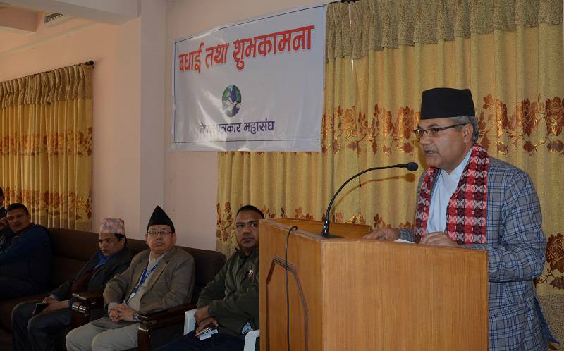 नेपाल पत्रकार महासंघद्वारा आयोजित बधाई तथा शुभकामना कार्यक्रममा उनले सकारले संविधानको मौलिक हकमा रहेको प्रेस स्वतन्त्रतालाई अक्षुर्ण राख्न नयाँ सरकार प्रतिबद्ध रहेको स्पष्ट पारेका हुन् ।