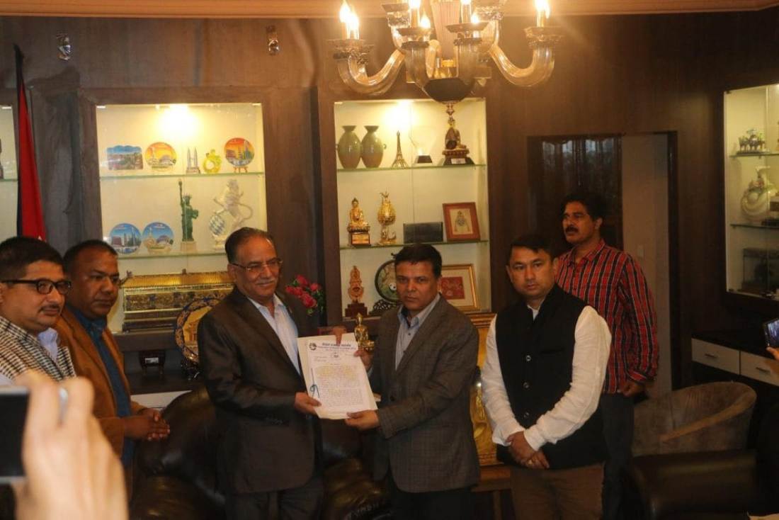 ‘पत्रकार महासंघको तर्फवाट तपाईँहरुले उठाउनु भएको कुरा जायज छ ।’ अध्यक्ष प्रचण्डले भने, ‘यो विषयमा पार्टी र सरकारमा छलफल हुन्छ । म पनि प्रधानमन्त्रीलाई यसबारे ध्यानाकर्षण गराउँछु । तपाईहरुका कुरा सरकारसमक्ष र्पुयाउने र सम्भव हुने जति काम गर्न म पनि पहलकदमी लिन्छु ।’