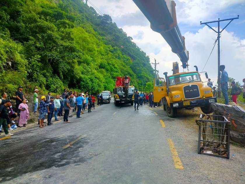 उनले भने, “बस निकाल्न प्रयोग गरिएको क्रेनको बुम भाँचिएकोले सडक खुलाउन ढिला भएको हो । क्रेनको बुम जडान गरिएपछि यातायात सेवा पुनः सञ्चालनमा आएको छ ।”