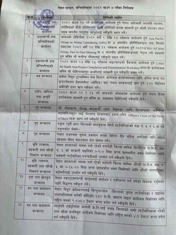 काठमाण्डु – मन्त्रिपरिषद् बैठकले बुधबार गरेका निर्णयहरू सरकारले सार्वजनिक गरेको छ ।