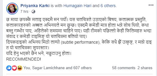 उनले सामाजिक सञ्जालमा फिल्म कमेडी मात्रै होला भन्ने सोचे पनि त्यसमा उठाइएका विषयवस्तु गम्भीर र कलात्मक लागेको बताएकी छन् । साथै कार्कीले केदार घिमिरे माग्नेबुढालाई उक्त चलचित्रको सुपरस्टार भनेकी छन् ।