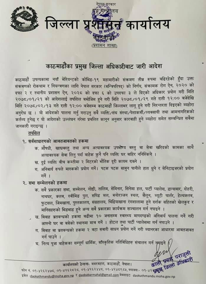 काठमाण्डु – काठमाण्डु उपत्यकामा निषेधाज्ञा १५ दिन थप भएको छ । आज काठमाण्डु उपत्यकाका तीनवटै जिल्लाका प्रमुख जिल्ला अधिकारीको बैठकले निषेधाज्ञा जेठ १३ गतेसम्म थप गर्ने निर्णय गरेको ललितपुरका निमित्त प्रमुख जिल्ला अधिकारी ललित बस्नेतले जानकारी दिए ।