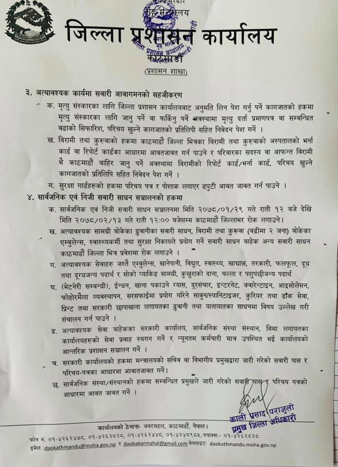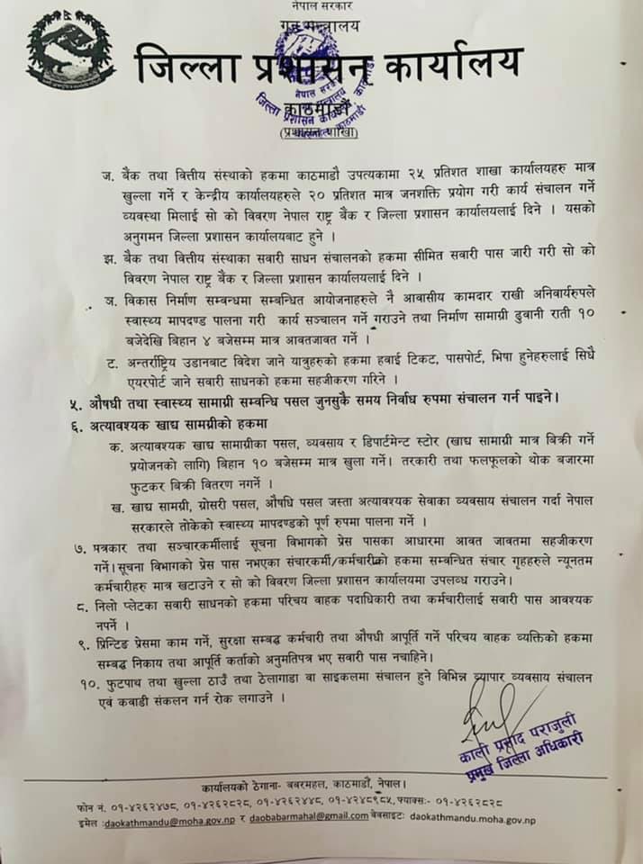 यस्तै बैठकले राष्ट्रिय प्राथमिकताप्राप्त विकास आयोजनाबाहेकका सबै निर्माण कार्य पनि रोक्ने निर्णय भएको छ । यस्तै किराना पसल र डिपार्टमेन्ट स्टोर विहान १० बजेसम्म खोल्न दिने निर्णय भएको छ ।
