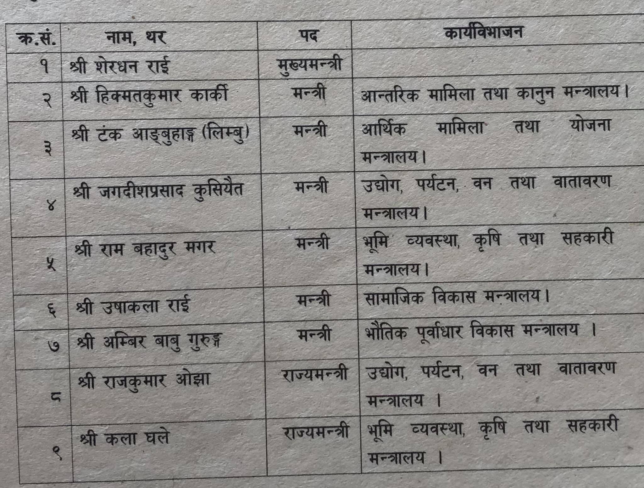 अर्थमन्त्री टंक आङबोहाङ, सामाजिक विकास मन्त्री उषाकला राई, भौतिक पूर्वाधारमन्त्री अम्बिरबाबु गुरुङ, कृषिमन्त्री राम रानाले पद तथा गोपनियताको सपथ लिएका हुन् । कृषि राज्यमन्त्री कला घले र वन राज्यमन्त्री राजकुमार ओझाले पनि सपथ गरेका छन् ।