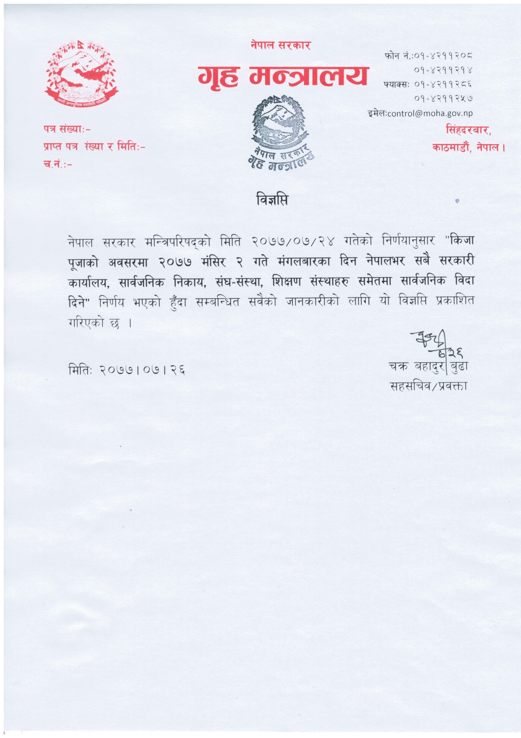 गृहका प्रवक्ता चक्रबहादुर बुढाले सरकारी कार्यालय, सार्वजनिक निकाय, संघसंस्था, शिक्षण संस्था बन्द गर्ने निर्णय गरिएको जानकारी दिए ।
