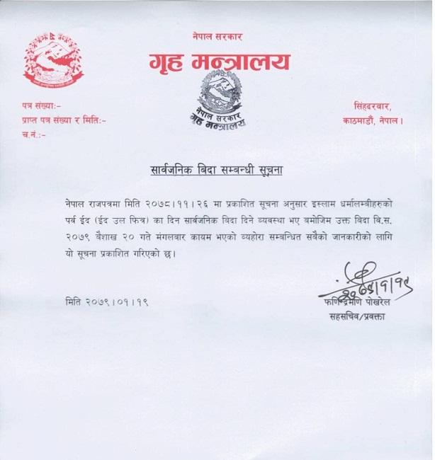 मुस्लिम धर्मावलम्बीहरुको महान पर्व इदको अवसरमा सरकारले देशभर सार्वजनिक बिदा दिने निर्णय भएको हो । गृह मन्त्रालयले सूचना प्रकाशित गरेर यसबारेमा जानकारी दिएको छ ।
