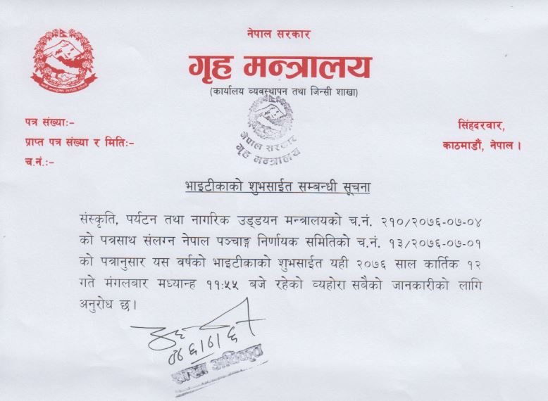 सरकारी क्यालेण्डरमा १३ कात्तिकमा बिदा उल्लेख नभएकाले मन्त्रिपरिषदबाटै निर्णय गराएर बिदाको घोषणा गरिएको मन्त्रालयले जनाएको छ । नेवारी समुदायको भाइटीका १३ कात्तिकमा पनि पर्ने भएकाले त्यस दिन बिदा दिन आग्रह गर्दै प्रधानमन्त्री केपी शर्मा ओलीलाई ३ कात्तिकमा एउटा टोलीले ज्ञापनपत्र बुझाएको थियो ।